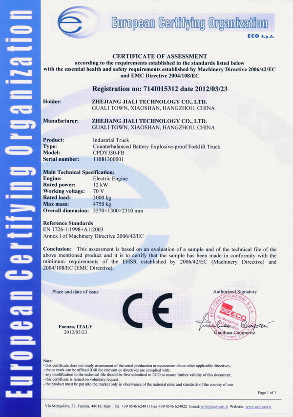 浙江佳力科技股份有限公司生產(chǎn)的全液壓防爆交流電動(dòng)叉車近日獲得歐洲CE認(rèn)證,為公司開拓歐美市場打下基礎(chǔ)。佳力公司是一家致力于研發(fā)、生產(chǎn)、銷售防爆叉車的專業(yè)廠家,為客戶提供安全、可靠、高效的防爆叉車是公司一直努力的方向 。