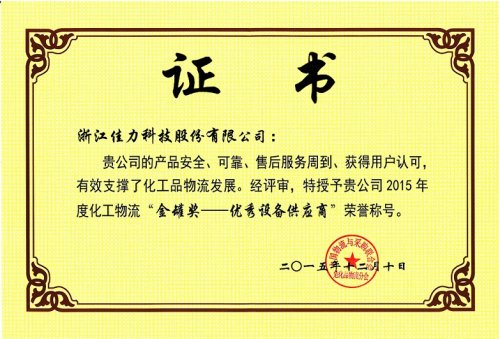 2015年12月10日-11日,由中國物流與采購聯(lián)合會危化品物流分會主辦的“2015全國化工物流行業(yè)年會”在寧波召開。圍繞行業(yè)現(xiàn)狀、趨勢及未來機遇,會議全面探討了化工物流的發(fā)展、變革與創(chuàng)新,并舉行了“2015中國化工物流金罐獎”的評選。在年度企業(yè)評選中,浙江佳力科技股份有限公司作為設(shè)備供應(yīng)商榮膺“金罐獎——優(yōu)秀設(shè)備供應(yīng)商”稱號。