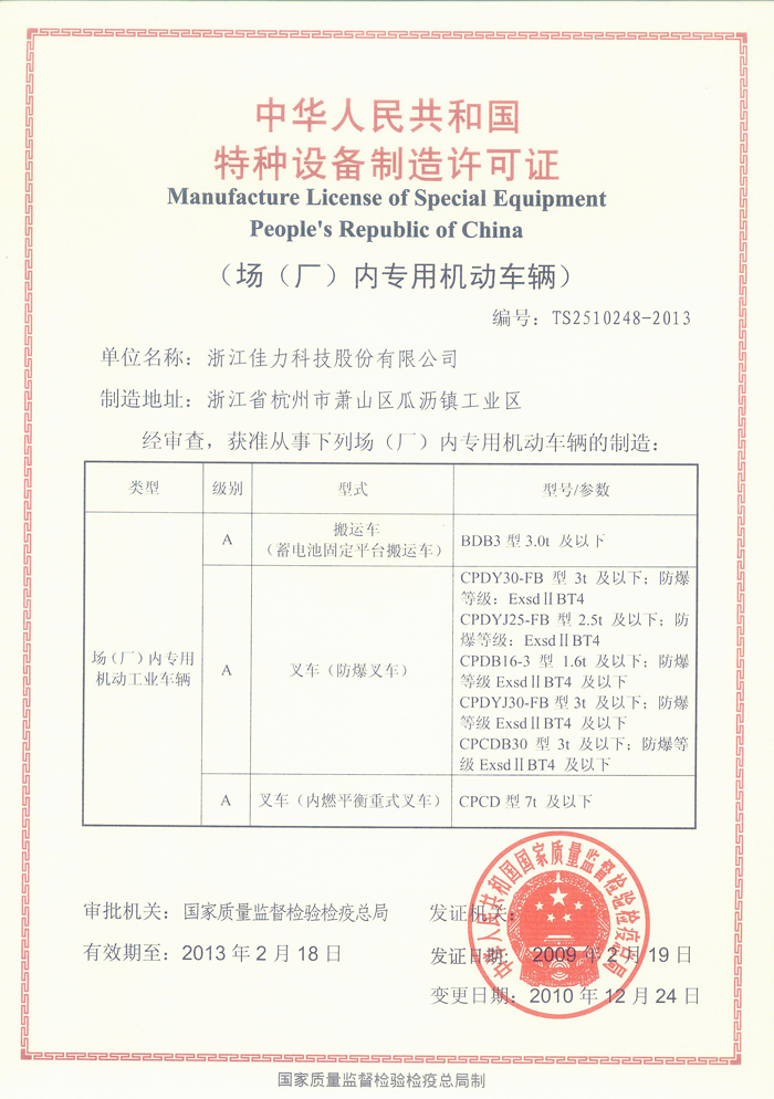 場(廠)內(nèi)專用機(jī)動(dòng)車輛特種設(shè)備制造許可證