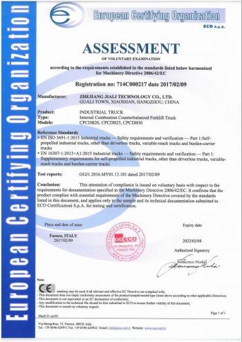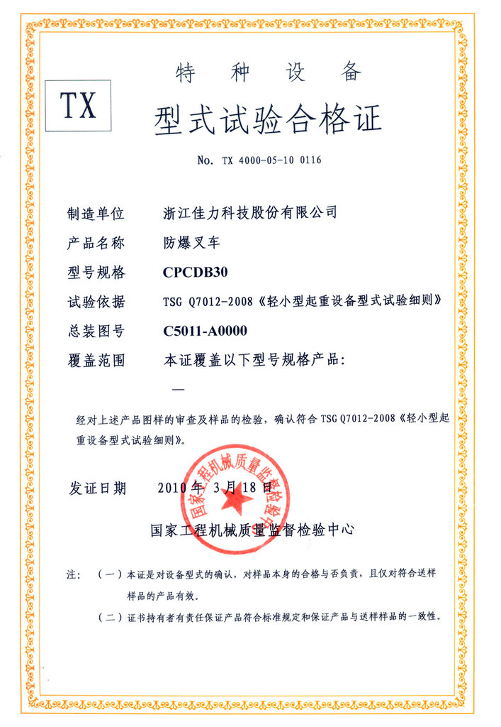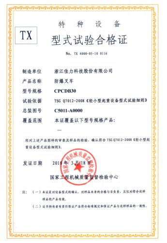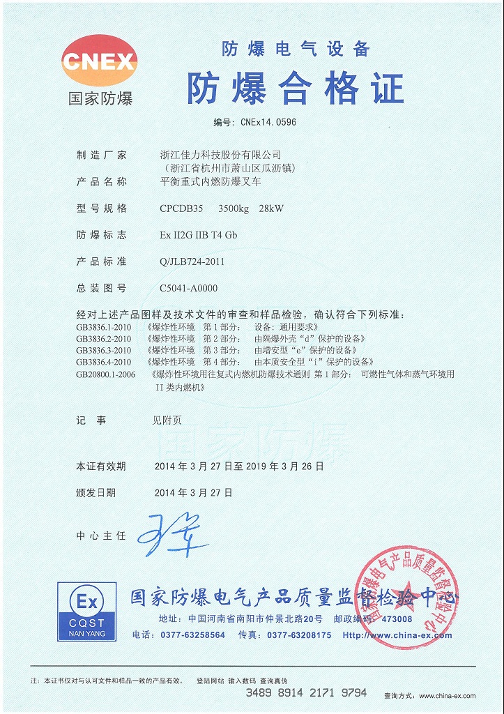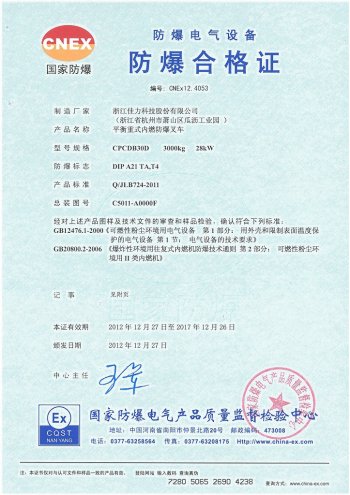型 號(hào) | 單位 | CPCD20 | CPCD25 | CPCD30 | CPCD35 | 額定起重量 | kg | 2000 | 2500 | 3000 | 3500 | 載荷中心距 | mm | 500 | 最大起升高度 | mm | 3000 | 門(mén)架傾角(前/后) | ° | 5/11 | 滿(mǎn)載最大行駛速度 | km/h | 17 | 最小轉(zhuǎn)彎半徑 | mm | 2250 | 2350 | 滿(mǎn)載爬坡度 | % | 20 | 18 | 外型尺寸 | 長(zhǎng) | mm | 3678 | 3808 | 寬 | 1295 | 高 | 2180 | 自重 | kg | 4200 | 4450 | 4510 | 4750 | 取得認(rèn)證 | - | 型式試驗(yàn)認(rèn)證、防爆認(rèn)證、CE認(rèn)證 | 防爆標(biāo)志 | - | ExⅡ2G ⅡBT4/ DIP A21 TA,T4 | 適用防爆區(qū)域 | - | 1區(qū)、2區(qū)和21區(qū)、22區(qū) | 爆炸性氣體組別 | - | IIB | 溫度級(jí)別 | - | 135?C (T4) | 認(rèn)證機(jī)構(gòu) | - | 國(guó)家防爆電氣產(chǎn)品質(zhì)量監(jiān)督檢驗(yàn)中心(中國(guó)南陽(yáng)) |